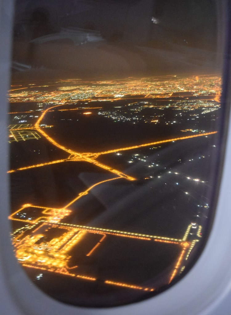 Sat on board, I was offered a selection of beverages and asked if I would care for a hot or cold towel, the screen in front of me had briefly reminded passengers to remain seated while praying, the captain did the usual announcements and told us all that this was a Boeing 787 Dreamliner and 40,000 feet would be our highest altitude, and things were forecast to be a bit bumpy in places; then I was given what was basically a pair of pyjamas and some slippers in a bag, and I decided to take my boots off. A slight delay was caused by a passenger who wasn’t feeling too well and had to leave the aircraft, which we were told by the captain, who sounded very British and experienced, and then we were all told to watch the health and safety video, which advised adopting the brace position in the event of an emergency landing. Movement began at 2:10 AM, lights were dimmed, the man sat across the aisle from me had a very phlegm-y cough, we joined a queue of planes heading for the runways via a green light illuminated path, remained in the queue until 2.37am, acceleration began at 2.41am, and we took off 30 seconds later.