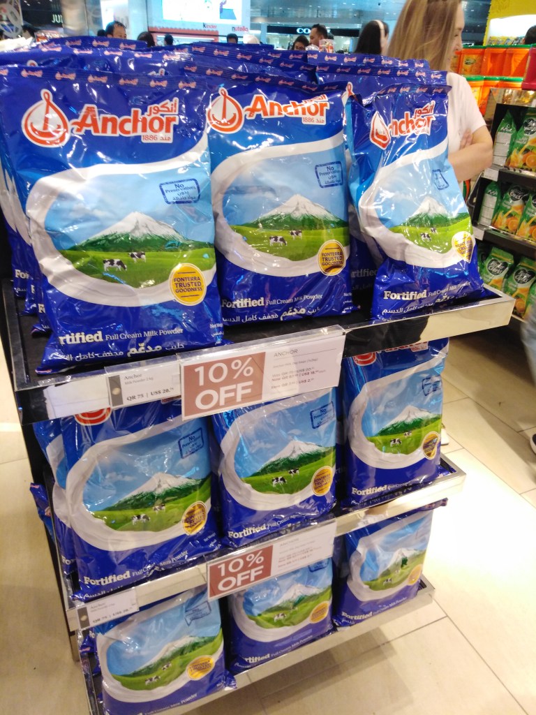 I was woken up about an hour later by the cabin crew man who was un-reclining seats and handing out more hot towels, and we were descending and things were getting a little bumpy; there was some time spent circling the airport, which seemed to be on the outskirts of the city and there were a lot of tall buildings and flashing lights around the bay, and we landed at 2:15 AM on my watch, when it was very dark and the man next to me had been coughing and sneezing a lot. The time was 2:22 AM while we were wiggling our way round the runways to the terminal, I was handed my fleece and we were all thanked for flying with Qatar Airways and all of us in business class were told it had been a pleasure having us when disembarking. I was given a little plastic bag as the cabin crew man thought it would be so much easier for me; and there were seven people, including me, on a very quiet bus (with relaxing music playing inside) being taken to the terminal, I didn’t set the scanners off, saw M&Ms dispensers, 750 gram jars of Nutella, 446 gram bags of Smarties, 2 kg sacks of fortified full cream milk powder…
