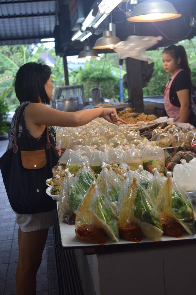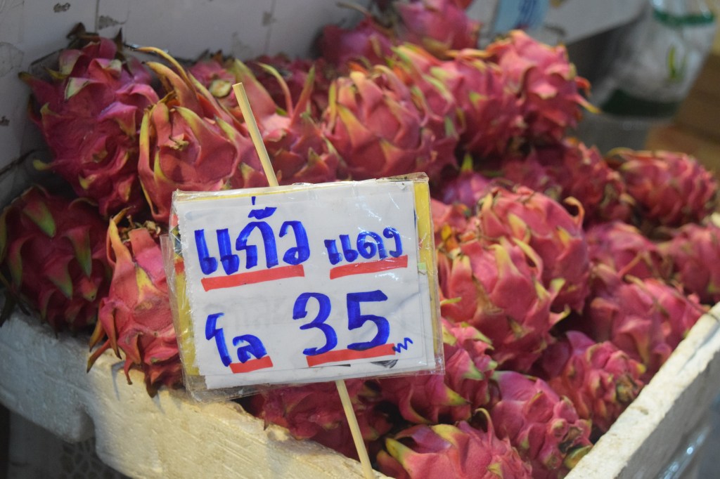 There were rows of stalls and Puiey picked up various things to show us – such as Thai coriander, durian, and rambuthan; at 4.37pm a man got out a microphone and started singing; in the meat section there was a red version of black pudding made from chicken blood, and above most stalls were metal prongs with backs on the ends twirling round (which are to swat away the flies); and we all got back in the van at 4.45pm and were each given a piece of (really really hot – but reasonably tasty) deep fried banana.