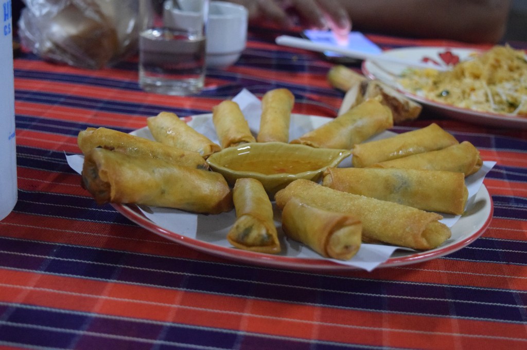 J had several lumps of yellow tofu in her basket, I had pig ear mushrooms in mine, someone had sticky rice, and there were lots of herbs; and then we came back again, we’re all given aprons and chefs hats, I persuaded Anik, the guide for our trip round Indo China, (who didn’t really want to wear 1) to put 1 on, and I photographed him, he insisted on photographing me. Everyone had a drink, hands were washed at 5.10pm, and Puiey told us we would be making pati first – and showed us the rice noodles, dried baby shrimp, dried white radish, Chinese garlic, brown sugar, tamoline, and several other things I forgot because we began chopping garlic, today, bean sprouts, and something else I forgot because I noticed Anik had got my camera and was trying to take a photo of me with it but didn’t know how to use it (I said – humorously – ‘Anik, are you sneakily taking photos of me?!’) (and I got it back). Then soy sauce and oyster sauce were added, and sugar, white radish, dried shrimps, and tamarin juice, and then we mixed it all up, I added a bit of water to mine and got rather sticky, we all plated up and sat down to eat it – with chopsticks – at 5.40pm. I had the chopsticks positioned correctly in my hand by Puiey, and I managed half the plate, but my little finger was hurting by that point so I gave up and used a fork. Puiey showed us galangal and a kaffir lime, and then we went back to the chopping boards to make spring rolls, and were shown how to cut (among other things) baby sweetcorn and jelly mushrooms (also called pig ear mushrooms). The cooking of all of these began shortly after 6pm, some of which I filmed; we all started peeling apart a small square of spring roll paper, put the filling in, rolled it up (in the specific way we’d been told to), and started the next recipe. That was yellow curry – and the people doing the meat version put chopped chicken with fish sauce (followed by brown sugar) in a bowl, and for green curry – we were given (after we found the 1 already in front of us was all brown and gooey inside) a small green aubergine, and chopped it up. Before cooking anything, some coconut milk, a leaf of ‘pandanas’ (I think) – which she said was of the banana family, and some palm sugar were mixed together in a wok, sticky rice (apparently that’s already cooked jasmine rice) was added and we all tried a bit. Everyone doing red curry added some spices, and while the cooking continued Puiey went round asking ‘too spicy too spicy?’ and offering to add spices if it wasn’t, I think it was M who said ‘wow that’s spicy’ when she tried hers, we all sat down to eat shortly after 7pm, and were presented with spring rolls 10 minutes later, followed by half a mango with sticky rice (each).