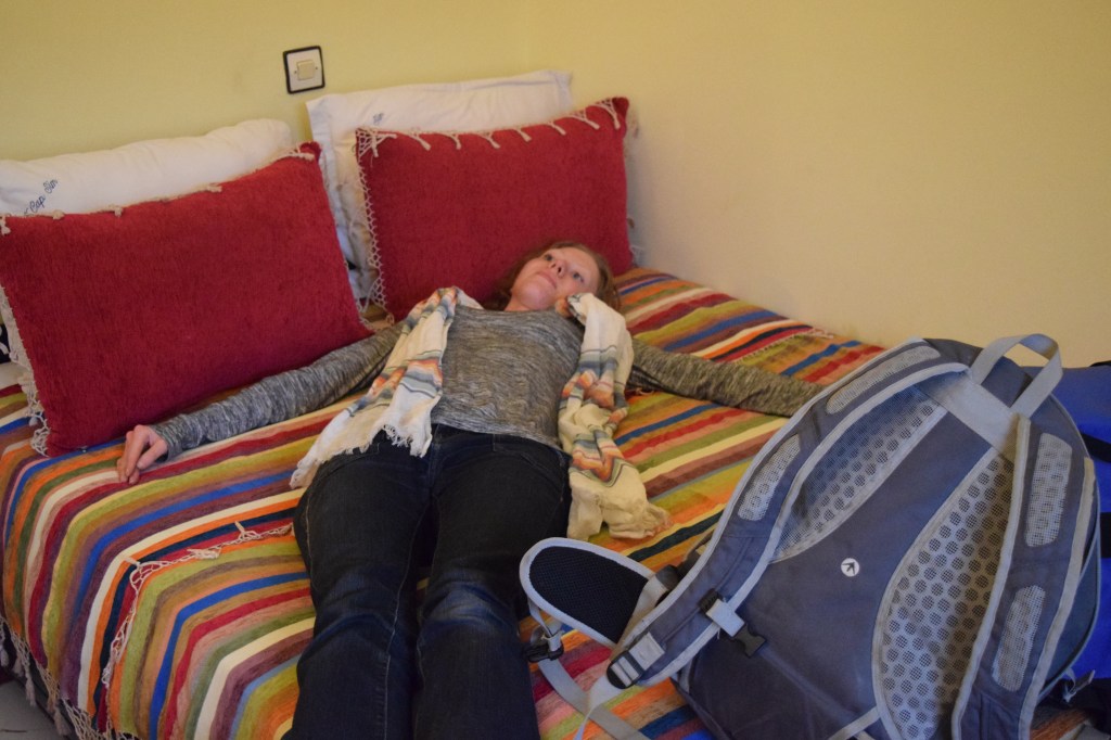 We got going again at 2.15pm (and Bella had a can of Apple flavoured stuff – the brand name was ‘Mirinda’), and stopped 10 minutes later at some services (which had orange trees outside it) where there were Cheetos of various flavours and fridge magnets. Back in the bus, someone said something about goats in trees, and a song (in English) called ‘shout to my ex’ was playing on the radio; most people had dozed off by 3.20pm; I saw several donkey drawn carts while going down a dual carriage way, and a big sign saying ‘Valle D’Argone’, and the whole road had fields of Argan trees either side; our guide said the city had lots of building going up in it, but it’s a beautiful city and the weather is amazing (and then said ‘because you’re an amazing group’ – which made everyone go ‘awwww!’), the farmland (for Argan oil) is owned by Moroccan people (and I saw another couple of camels and vaguely wondered to myself if a mini camel could ever be created – i.e. like a camel version of a Shetland pony). Essaquirra – the city we arrived in just after 4pm – looked very very touristy and modern, our guide said some stuff about the medina and that he’d called a man that he knows with a cart to put our stuff in; and we got to Hotel Capsim (which was almost luxury) – our accommodation for that night.