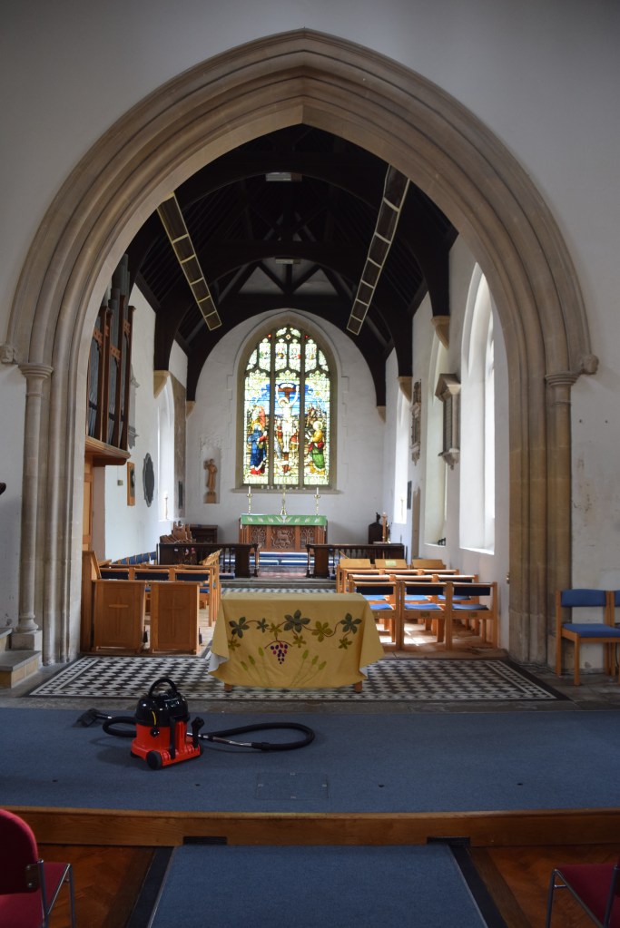 It looked as if someone was cleaning in there, and the altar had a small Henry Hoover in front of it and around 100 seats, and we had a little look around.