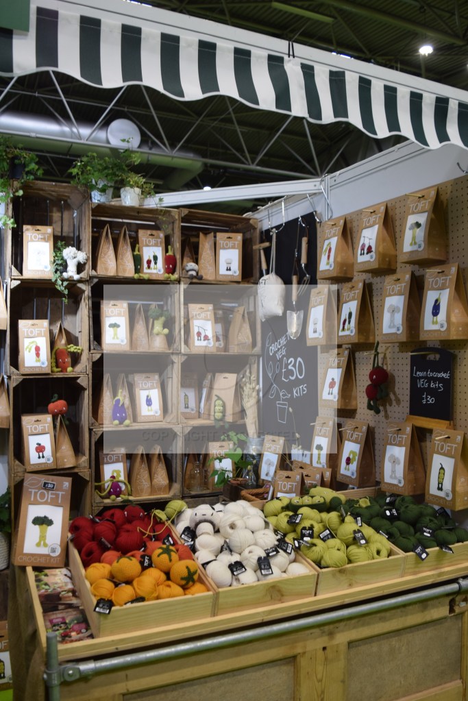 Weed Burners, water pumps, and lawn aerators were among things being sold by Draper Tools, Rotospa (apparently the Uk’s only Spa pool manufacturer) had tubs of pH increaser, Bullbarrow had lots of different coloured wheelbarrows, Moonshine was selling some sort of plant extra mixture; and by 12pm Monty Don was on a stage taking questions about fennel, coriander and dill, and a bloke nearby was doing sign language. Bulb planters, capability trowels, oscillating Joe’s, hand 3 prong cultivators, and perennial spades were being sold by the Kent and Stowe stall, and the British Garden Centre 1 was offering a free trowel for the first 100 sign ups, and selling illuminated wind spinners and flutterby butterflies; and TOFT: Crochet Garden Kits had crochet kits for vegetables – including mushrooms, broccoli and pea pods…