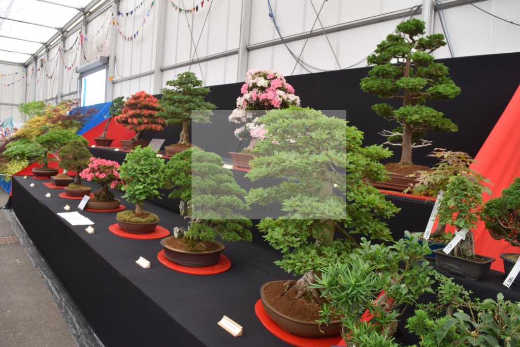The floral marquee was entered at about 1.10pm – where there were tiny trees, a hanging basket stall had banana split plants on it, a tiny pond was in the middle of a mini display garden, and a tiny tent was in the middle of the other one; a bloke called Conrad was manning the Woodland Trust stall, then Mum grabbed a leaflet about cruises and wanted a photo taken of something about ice gardens. I photographed more bonsais, ice alpines, and a big Harts Nursery stall was selling an unbelievable variety of lily bulbs; and the hall was exited and ice cream was found, and we sat under a tree to consume it.