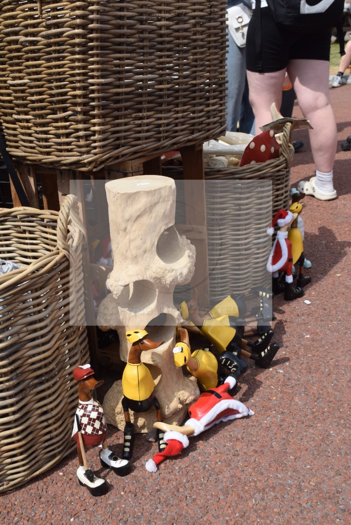 It was 2.05pm when we got up again, the choir was still going, wheelbarrows that had been used as planters were admired, the British Bee Keepers Association had a shed – which was showing a brief film of bees inside, and had a military looking truck outside; and the We Grow Stage was passed before re-entering The Floral Marquee and going along the final row: of Bonsai plants, carnations, lavender, roses, pensterman, sweet peas, pond plants, orchids, gladioli, dahlias, fuschias, pelagoniums, a Calamazag plant nursery stall obsessed with dianthus, and a very nice little garden made by Dibley Nurseries; and W. Robinson and Sons had a mammoth pumpkin in a wheelbarrow. It was drizzling when we left the marquee at 2.37pm; the choir was still singing, there was another Jardin De France stall outside, and a lot of wooden ducks (in various sizes and positions – and some in different clothing styles).