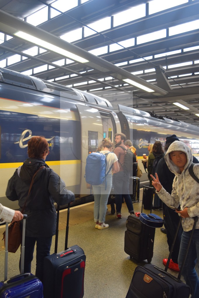 We went through electric boarding pass checking barriers and through the security barriers (which Mum set off for no apparent reason – as usual), and then – as she wanted breakfast, The Station Pantry was stopped at. A bloke behind the counter started yelling something, a woman was very keen to get breakfast was amongst customers, Mum got out a little pot of porridge for her breakfast, and while we were sat there, a really thin bloke of around 6ft 7” was strolling around, a man and a woman (both early 30s) were gazing at each other and holding hands over a table, and then started feeling each others faces, I could hear someone talking about waffles, a small girl in a pram was holding a Disney Princess magazine, and a bloke stopped and did something I forgot because it was pointed out to me that a limping man I noticed had huge feet. I remarked on the numbers of wireless headphones and how almost everyone had a smartphone out, by then I was wondering how long it took to build this place, Mum told me the tunnel was 1 of Margaret Thatcher’s better decisions, the appearances of other passengers and staff were discussed – and she pointed out a man who she thought was good looking; I was wondering about the percentage of passengers who were French and doing a morning commute and the number of British passengers fluent in French, a woman at another table was holding her phone up and seemed to be doing a video call, and the woman sat opposite her seemed to be eating a sandwich made from 2 croissants. By the time we started boarding the 8.16am train to Amsterdam I’d forgotten the final destination; we went up a rather steep travellator; once by the train, Mum wanted to take photos of both of us via my phone for our travel company, which was done, and when I took 1 of her boarding, a small Japanese looking boy did a bit of photobombing (which made me smile).