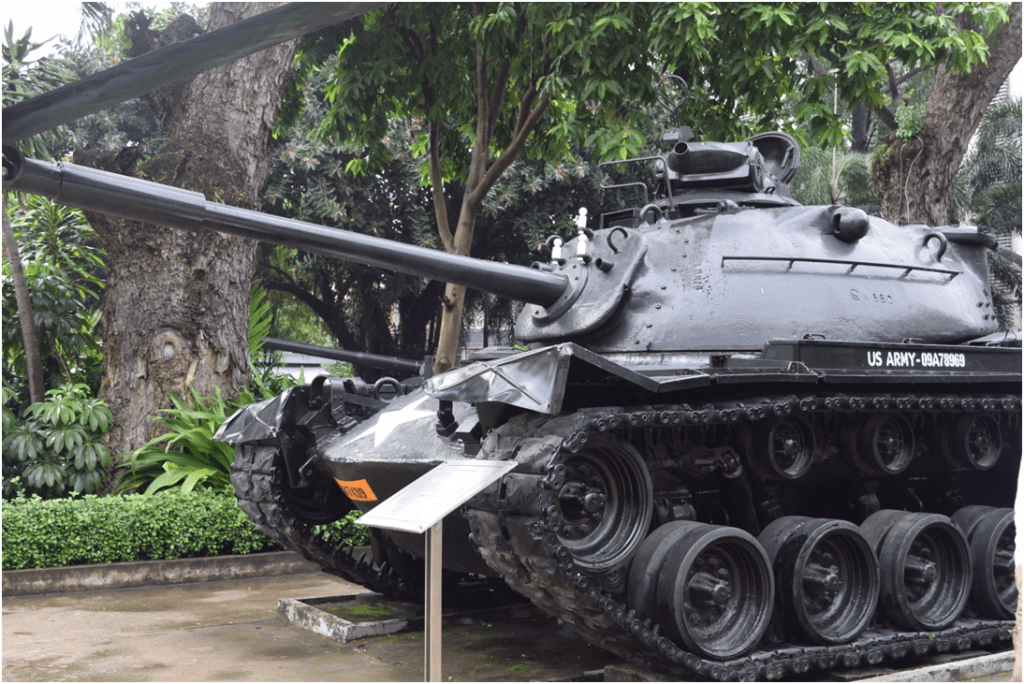 We got to Hong Hac Boutique Hotel at 12.45pm; in the lobby 3 minutes later everyone was transfixed by their phones, we were given room key cards, and I went and tried to sort myself out, got muddled up and ended up being late again. When I got down, we all went off to a place for lunch: people at my end of the table ordered milkshakes; when they’d arrived they were talking about things I forgot because I was told I’d been bitten a lot, and rain started at 1.55pm – and 5 minutes later it was absolutely pouring, and people on motorbikes wearing waterproof ponchos were whizzing past the window. People around the table were talking about where their offices/places they work in were located, C began eating/sucking a piece of lime that had come with 1 of the meals, and it continued to pour while we ate, paid, and walked down the street to a museum of the remnants of the Vietnamese war (1954->1975) – and it was still raining when we made it there.