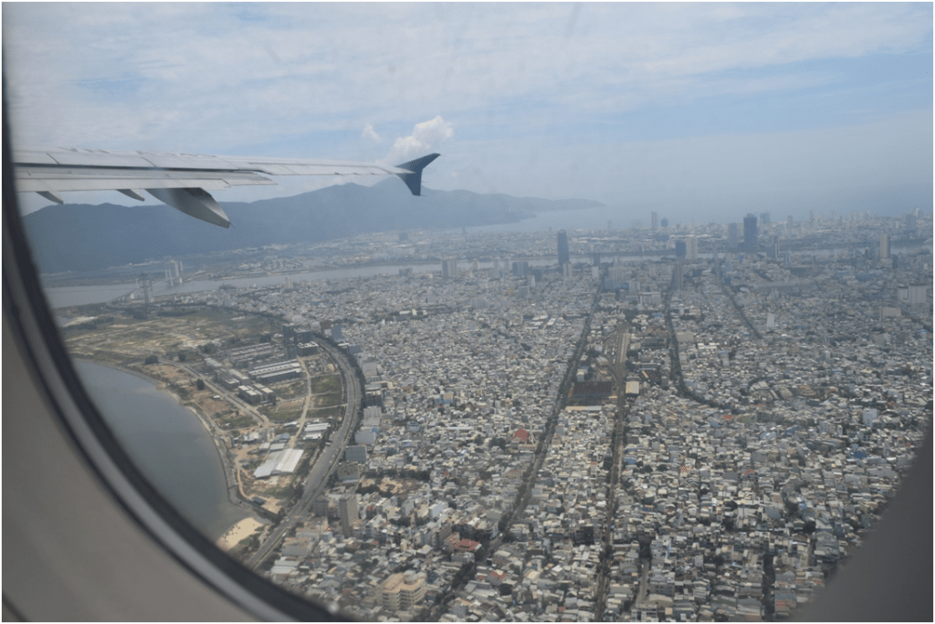 A huge area of half built house type buildings that were all very very brightly coloured that we passed at 8.30am had a big sign saying ‘Coco stakes – the worlds entertainment destination’ at the front; My Khe beach was on the right 15 minutes later, and we passed a ‘the giodidang shop’ (whatever that is)(and then we passed another one about half a mile up the road – it sells phones and tablets); 30000 dong was paid to get through a toll gate 10 minutes after that, and we got to the airport at 8.55am. While checking in, N began wondering where he might’ve put his Swiss army knife (he’d found it before checking out of the hotel), and we were chatting about general airport security; I couldn’t spot where the rest of them had gone after going through and spent about 10 minutes sat there until I did spot them at a coffee place, went over, sat down until 9.40am, and then went down to the boarding gate with him and D. There were a couple of souvenir shops down there – also selling the usual packeted food – but I did see some small packets of wasabi coated green peas, dried plums, and dried mango pieces; and I sat down with the rest of the group 5 minutes later, by which point everyone was finding N’s passport photo very amusing, our guide was prodding his phone again, and a man next to him who was doing that as well was also constantly moving his legs around and looked desperate for the toilet, and D and P were talking about something that – from what I overheard – sounded like ‘bubble tea’. We got on the little bus that takes you to the plane at 10am, and several of the Chinese people also on this little bus had surgical mouth covers on; it was absolutely boiling when we got off this bus 5 minutes later, and I was sat in between C and the girl whose name I had now confirmed began with J – until everyone realised that there were loads of spare seats and therefore the 3 of us got our own row. Everyone was given a random ‘refreshing tissue’ (i.e. a wet wipe) by 1 of the cabin crew, had to watch the typical ‘safety demonstration’ (shown on the little TV screens that fold down from the ceiling) – which had peculiar music (presumably meant to be cheerful) throughout it, then adverts were shown for ‘Iona – a must see show in Hanoi’, and some sort of substance in a can (that I thought was beer). We took off at 10.35am; I attempted to photograph some of the stuff below us…