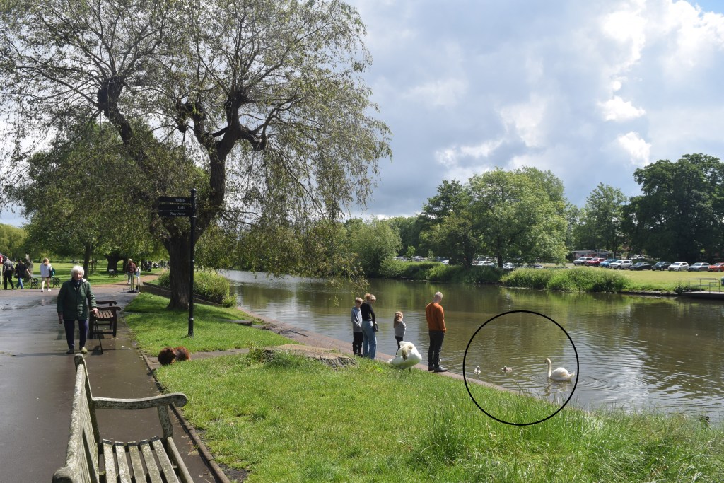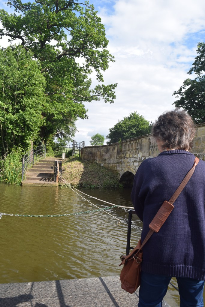 My mother yanking the rope of a hand pull ferry to transport us across a lake built by Capability Brown…