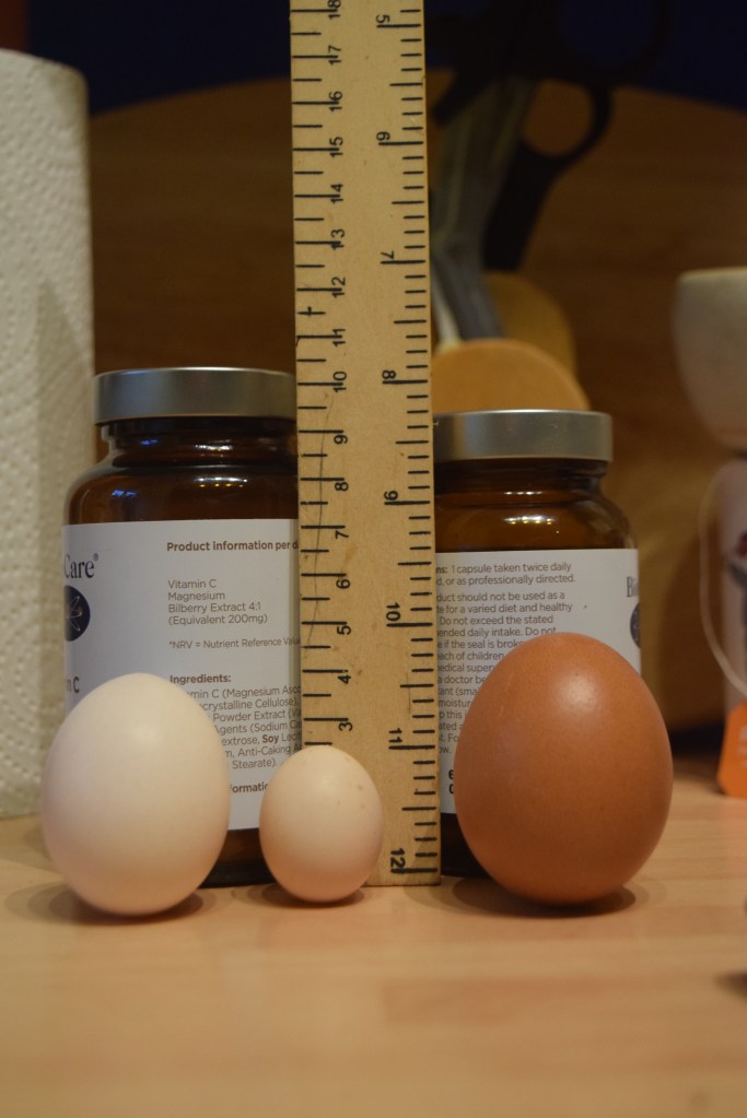 Comparing egg sizes! Left to right: the usual size from our bantum chicken Willow; an unusual one that popped out from her one day; and the average brown egg bought in a supermarket.