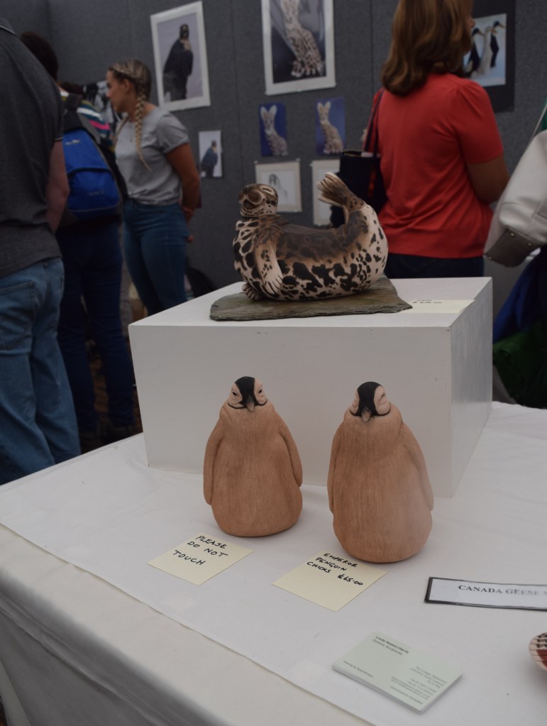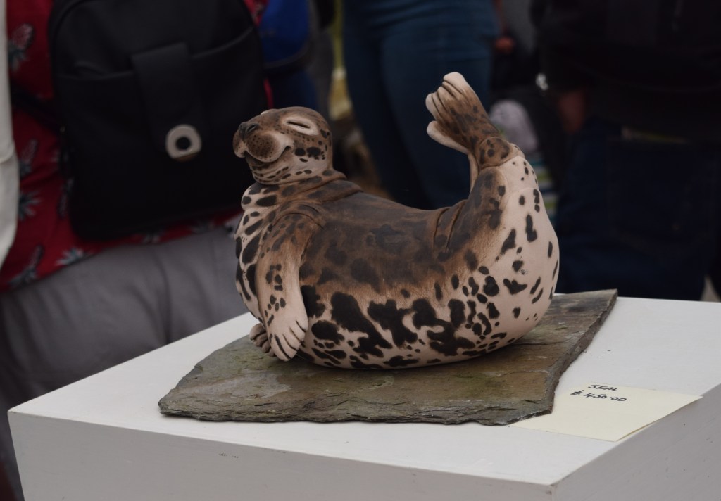 Past that main entrance was the main event, a big wall of hay bales with small – what I would term – antique tractors next to it, and various food stalls – 1 of which was selling gourmet hotdogs, there were remote cameras (visibly rotating) on poles positioned around the paths, and it began raining at 10.30 – so we went into the nearest tent, which included a Raw Workshop stall selling products (chairs, tables etc) made by disadvantaged people from recycled wood, a stall of pottery items that included statues of cheerful Emperor Penguin chicks and 1 of a seal was next to that…