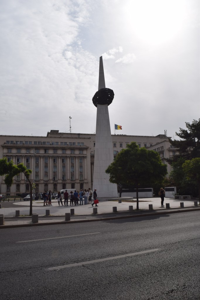 We reached strada Stirbei Voda, and P pointed out a massive trail of ants crossing the pavement and coming out and going into a tree, pigeons were everywhere in the park sort of place, an incredibly rusty old car was on the street prior to Revolution Square – where a white spire with a blob on it symbolizes Romania, (which P thought was symbolizing communism and I thought it looked like a gone wrong pom-pom) (Wikipedia says: The Memorial of Rebirth (Memorialul Renașterii in Romanian) is a memorial in Bucharest, Romania that commemorates the struggles and victims of the Romanian Revolution of 1989, which overthrew Communism. The Memorial of Rebirth has been described as “the impaled potato”, “a potato skewered on a stake”, an “olive on a toothpick”, “the potato of the revolution” and “the vector with the crown”.).
