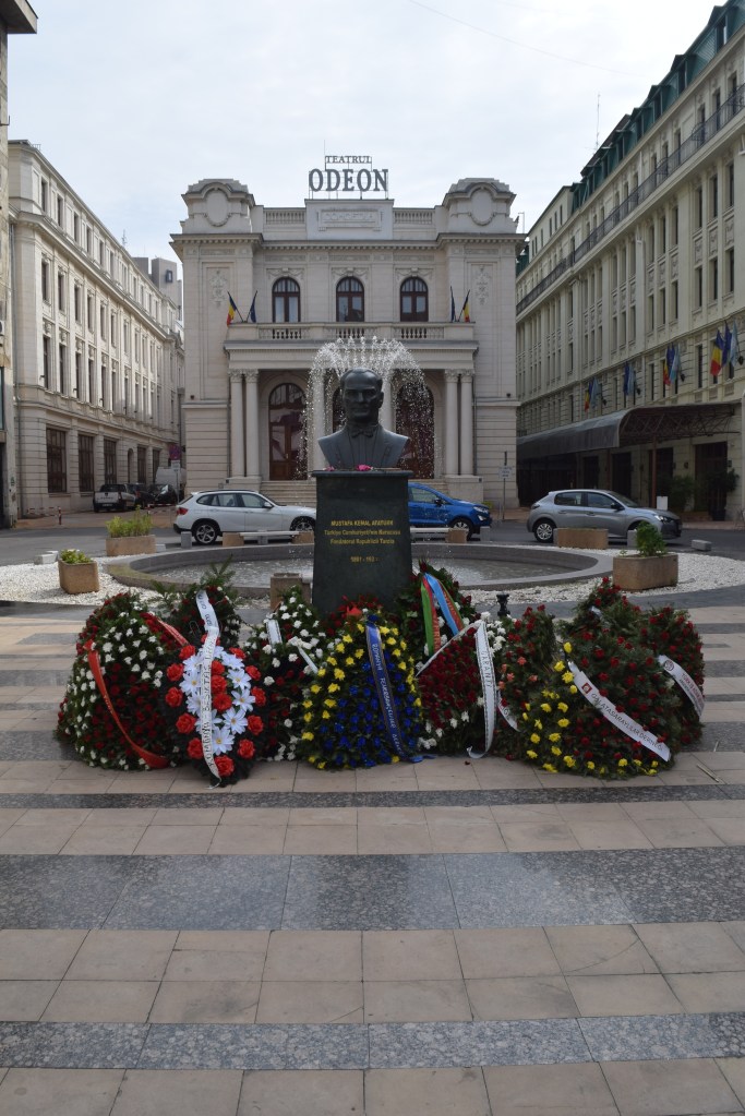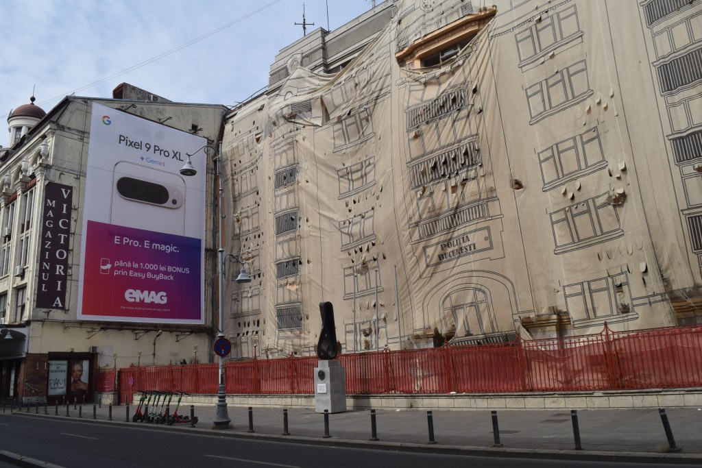 Calea Victoriei was a closed off road that we crossed to a building (with a statue surrounded by flowers – and P said that man was the founder of Turkey), Teatrul Odeon was something I forgot; and further down was a butchers with scarily large bits of meat in, a massive building covered in a sheet, and a huge advert for a Google Pixel.