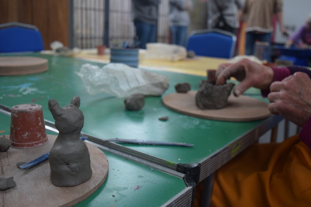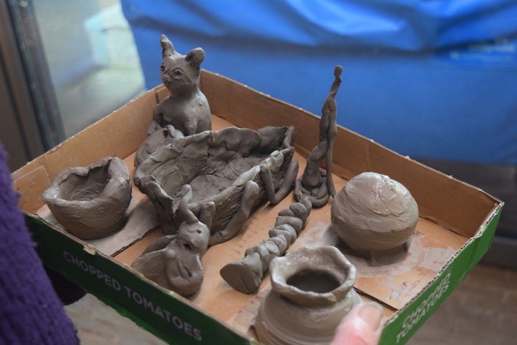 A woman mentioned making little Christmas trees out of clay; using flour to prevent sticking – rather than greaseproof paper – was mentioned by the man, and that solid lumps of clay would explode in the oven (and I was wondering if coils could be kept rather than smoothed off) (and how bigger things stick). It was 11.48am when clay began to be handed out, and I attempted the methods demonstrated, failed, and decided to do it my own way; and I’d made good progress on a small cat model by lunch time.