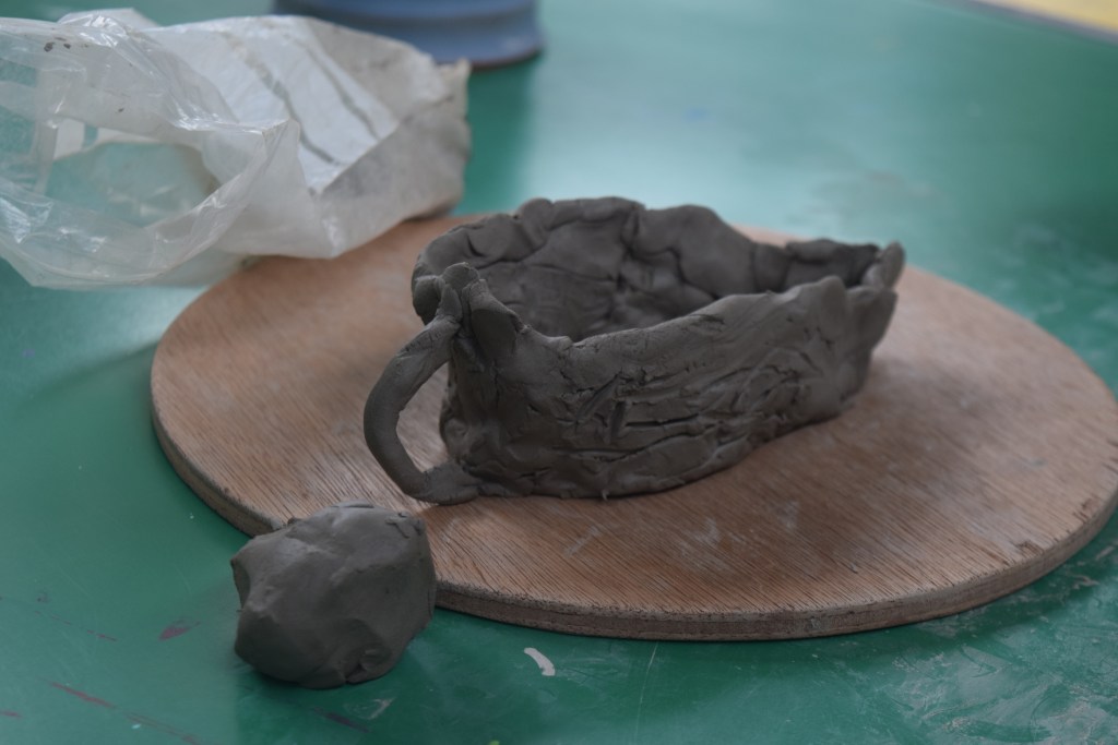 When the wheel got going we were told to resist the temptation to do something I forgot (I forgot it because he remarked on how it was doing finger exercises physiotherapists advise) – and to keep elbows down, fingers on the inside and fingers on the outside, and to squeeze and lift while releasing the pressure; then that ‘shaping is a revelation for people’ and to celebrate our shape, get the water out before we stop, use the end of a credit card to scrape round the bottom, and run a wire under it (and thoroughly dry the wheel). Then his pot collapsed (and I noticed ‘passed’ stickers on the 4 wheels), we were shown several other things he’d made, he mentioned a video of 5 Japanese women working together on the same wheel to make something, and he said we’d be making snakes first and coiling them round plastic flower pots wrapped in greaseproof paper.