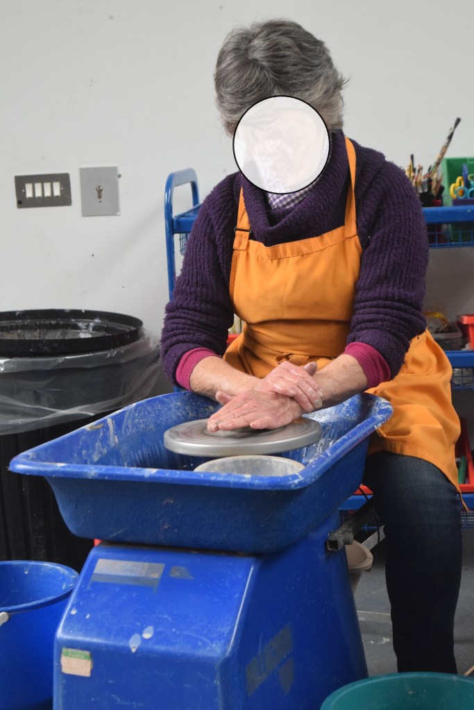 …the gift shop had 150cm long soft toy snakes, Poo Bingo sets, and Christmas decorations (among other things) for sale; it felt cold, things were misty, I began shivering, and someone dashed in and said something I forgot. In the place called the studio a book that appeared to be titled ‘The Day The Crayons Quit’ was on a trolley, and I had a quick look at it before connecting to the WiFi (and most of the other people there were retired). The 12 of us there were led upstairs by someone who told us stuff about fire exits, and the name of the bloke sat with the 4 blue Millacron pottersmate machines. He then showed us some of his stuff, said a lot, and submerged something in a bucket – which then made loud bubbling noises (and I noticed a lady clutching an umbrella); we were told that clay is 250 million years old; then he put a lump of clay on a wheel and said we’d be looking for something shaped like a bread roll when beginning, to keep our elbows down, that the clay has to be centered, and at 10.53am – a wheel began spinning. ‘You push and you shove’ and ‘always take your hands off nice and slowly’ (and not to undercut anything) was how we were advised to begin things; and at 10.57am he took his finger out of the clay and said ‘I’m just going to have to blow my nose, sorry’. By then Mum had made a start on what she said was a gravy boat…