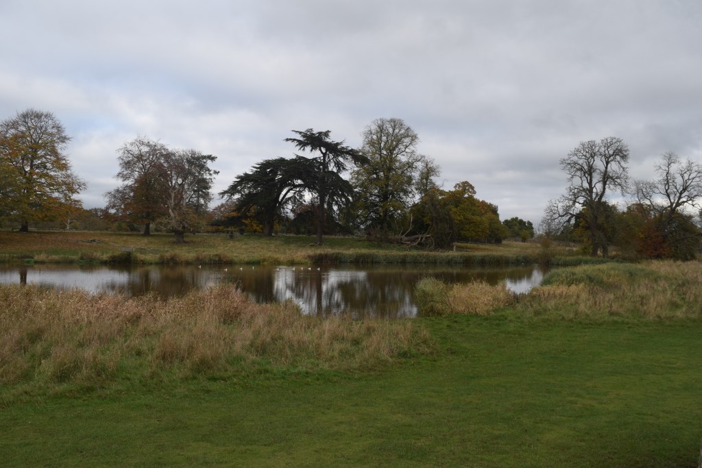She tried to commentate on our progress and picked up some very thin branches, deer were grazing in their sanctuary, we crossed a bridge crossed earlier – and wheelbarrow racing was going on by then; and in the Wood Yard area at 2.17pm was a woman wearing a puffa jacket vest. A carrot and walnut muffin sort of thing got consumed by Mum in there (Uncle had millionaires shortbread), and we wondered about the Conservative leadership contest going on today, so I got out my phone, connected to the Wi-Fi and discovered Kemi Badenoch had won it. Empire Day being celebrated in his childhood was mentioned (it was done on 24th May – nowadays its Commonwealth Day – done on the second Monday in March), I noticed pumpkin spiced lattes on the menu, was told Uncle eats 6 spoons of tomato ketchup per day, and it was approaching 3pm when we moved again. A tree lined avenue next to the main driveway was headed down, a deer grazing on the other side of the river (which had a couple of swans on it) decided to gallop across the drive…