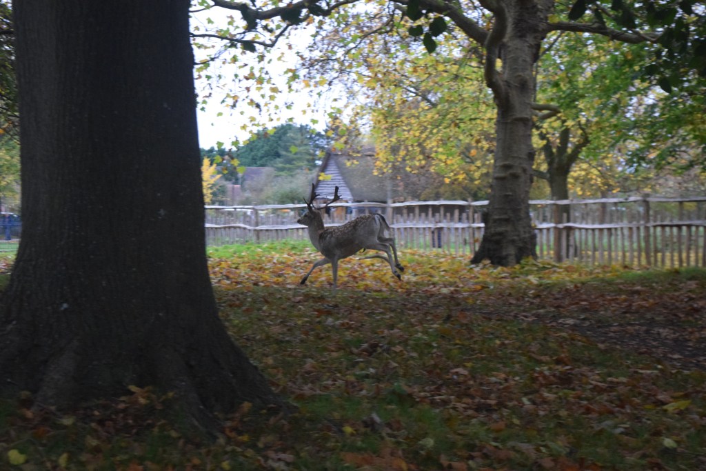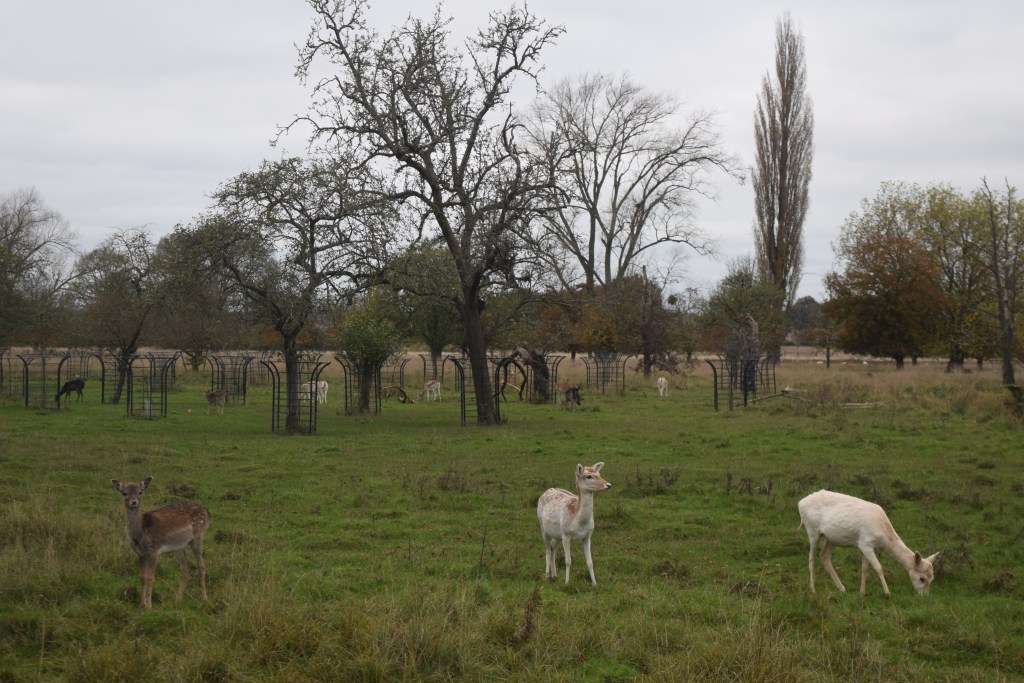 We continued, passing a sign about zombie veg; bowling pins and plastic wheelbarrows were on the grass near the Old Kitchen and briefly entertaining children; then we went over a bridge, passing a deer sanctuary (where deer were curled up and looking very relaxed), and continuing round paths with very knobbly partially disintegrated trees I spotted a leaf dangling by a cobweb. Mum got interested by a lump of poo and a big tree; another couple of groups of deer weren’t far from the path; and at 1.55pm, an avenue of partially bald of leaves but very hairy trees was reached.