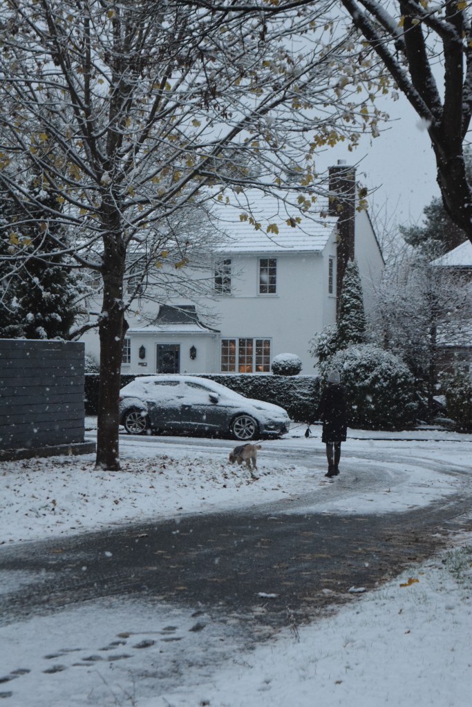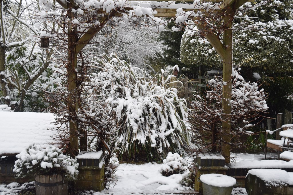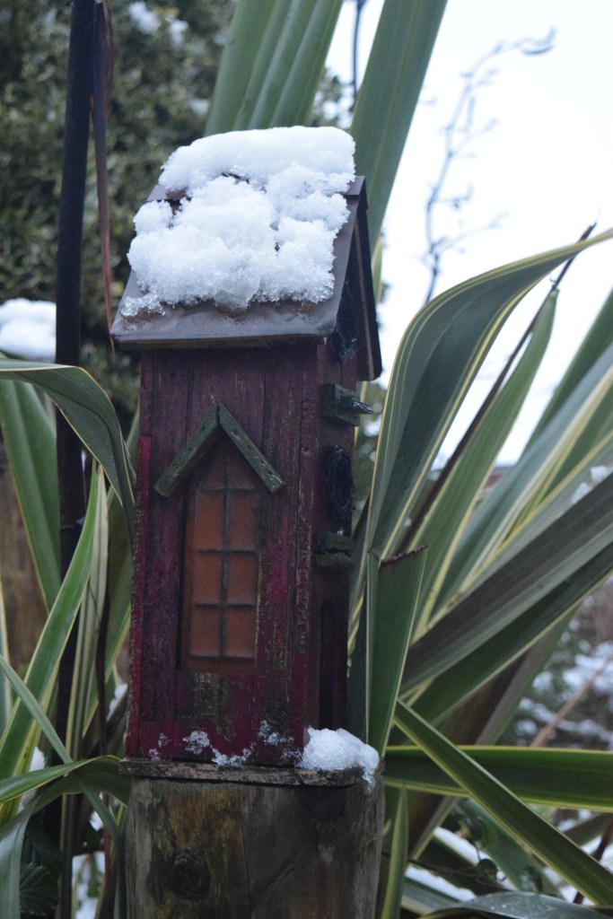 A rustic – currently frosty and uninhabited – little bird house in the back garden