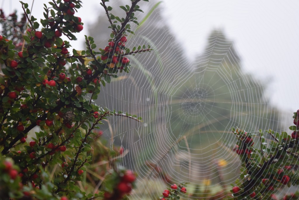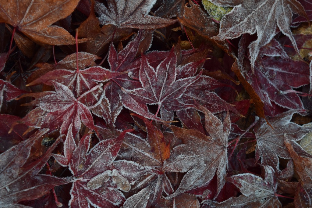 Bright red slightly snow covered what Google Lens later told me were chrysanthemums