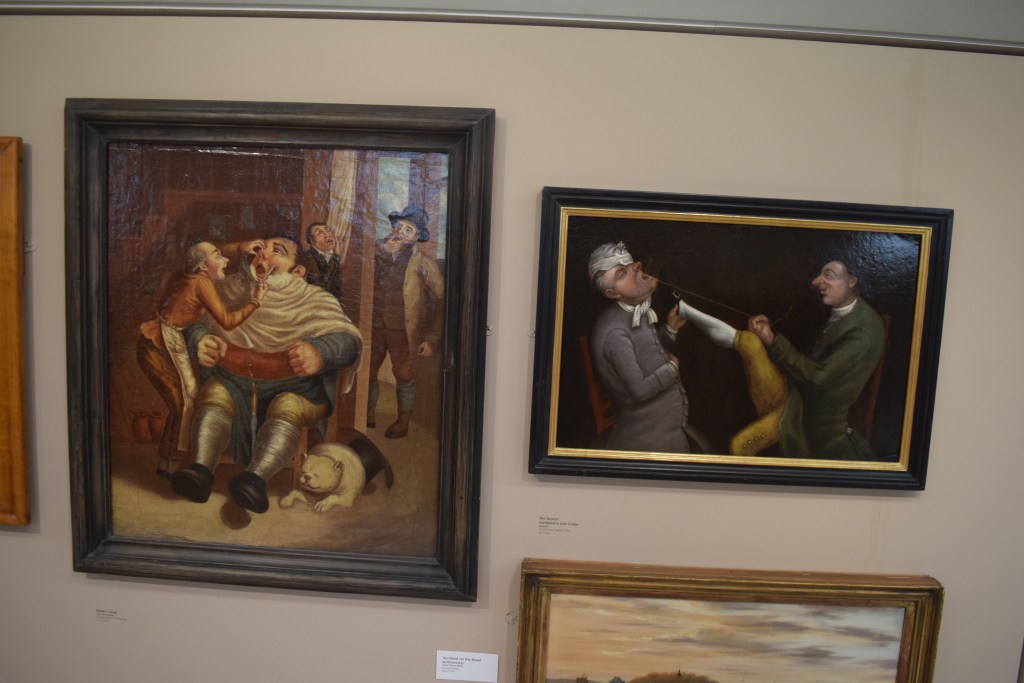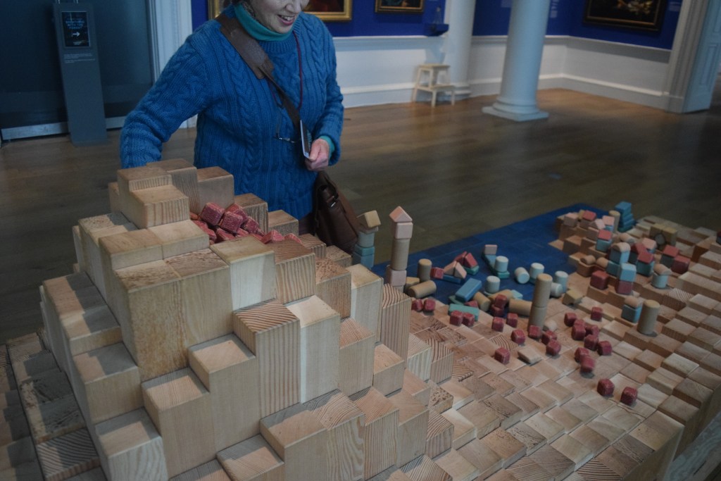 The next 1 was titled ‘The River of Black Stone’, had some massive rocks in it which were from a site of volcanic activity (most of which were white); the room after that’s rocks were white – and a tiny painting looked like a dog doing a poo; the next one was The Ides Of Somnolence, was very dark, had recorded poetry being played via a loud speaker, and had some disintegrating metal stuff on the walls (including what may’ve been a duck and a carrot). By 11.42am we were in a ‘Chinese discovery room’ – with a couple of big bronze statues (1 was holding a replacement wooden sword); the next 1 had lots and lots of food, wine and cooking vessels – as well as horse statues (and The Heavenly Horse had very big testicles); and up some more stairs was a folk art exhibition (with an vac-chair outside it) – including pigs, a 3 legged dog toasting fork and a big metal ladle, and a sculpture of a really really big man. Up the next set of stairs (a sign said The Attic Gallery) were more paintings, a massive teapot, another sculpture of a big man missing an arm, a big gold swan, and a really big pestle and mortar; and then a cabbage grater, paintings of an unpleasant looking dentists surgery and an unpleasant barber, and 1 of unusual looking pigs.