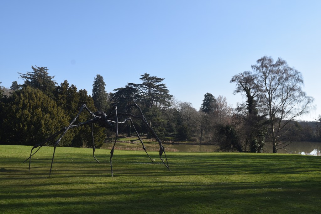 We got up at 1.10pm to go for a stroll outside in the Capability Brown landscape, sun was very very bright, and 3 jet trails, a propeller plane and some seagulls were in the sky; Mum was clutching her cake slice – and pointed out a strange sculpture/metal wiggles; there was a sculpture of a horse and cart with what looked like giant pistachio nuts on it, and 1 of an enormous spider…