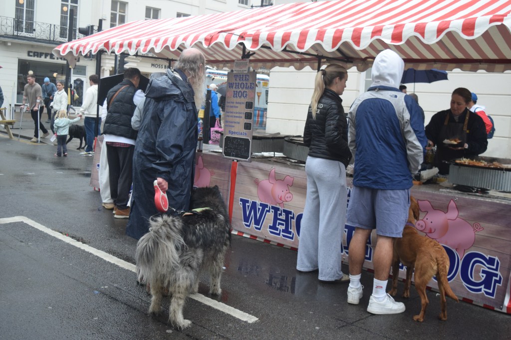 Back on the high street – Sicilian arancini and Sicilian cannoli were on one (and a notice seemed to reveal them to be rice balls); The Cookie Jars cookies were enormous – and advertised cookie pies and things called blondies (and upon investigating later – I discovered they’re butterscotch brownies); bees, tortoises, turtles, chickens, flowers, and a lot of other stuff was on a crochet knitting stall; and several tables down the street (next to one selling stained glass) was ‘The Dog Deli’ – and a dog in a waterproof was getting excited by pizzles (and puffed pig snout and beef trachea were among things for sale); a woman holding a big bunch of helium balloons (including SpongeBob Squarepants shaped ones) looked extremely grumpy, and another stall caused me to discover what kalamkari, and kilim and pateh are. The one next to that was paintings of foodstuffs – including Kellogg’s cornflakes, vegemite, a half eaten crème egg…