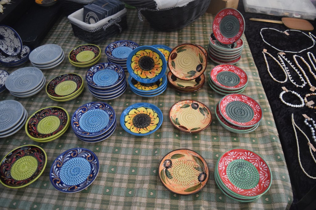 I began my way back up the other side of the road at 1.10pm: Slow Toad Candles were also selling postcards – and were next to a sweet potato spirit stall advertising ‘toffee apple moonshine’, designer leg wear was between that one and a slightly odd natural plant medicines one – and the bloke behind it seemed to be discussing blow jobs with a customer. The Little Garlic Plate was selling very pretty plates that seemed to be an old Spanish idea (they’re ridged – so rubbing stuff on it grates the substance), and I was right next to a cash point and couldn’t restrain myself; and I had a chat to the man running it – who said a Spanish company makes them for him and uses little wheels to make the ridges.