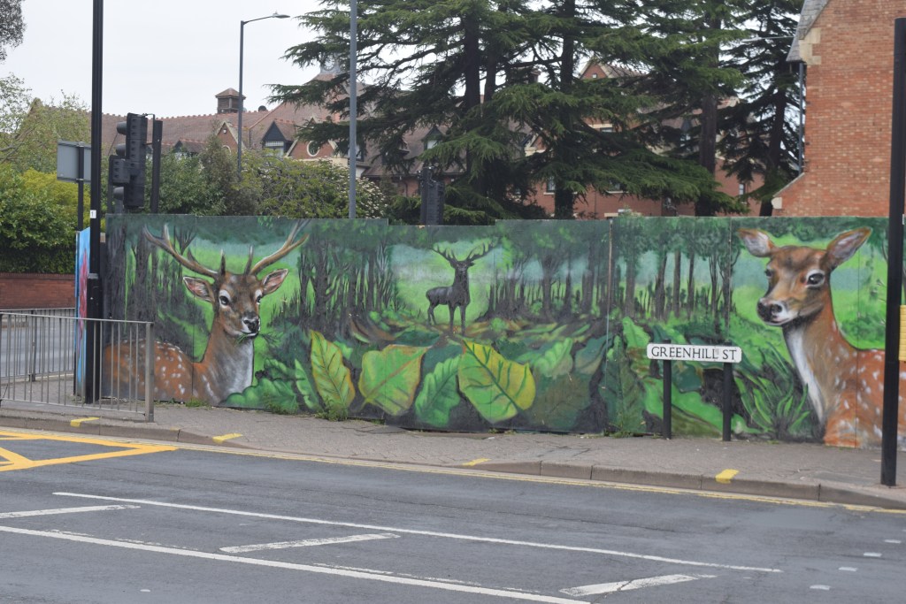 Out on a bus at 10am (and I’d already written a page by then – but this was my first photo of the day)(the final totals were 147 photos and 7 pages of notes) a mural sort of thing on boards on Greenhill Street was passed by…