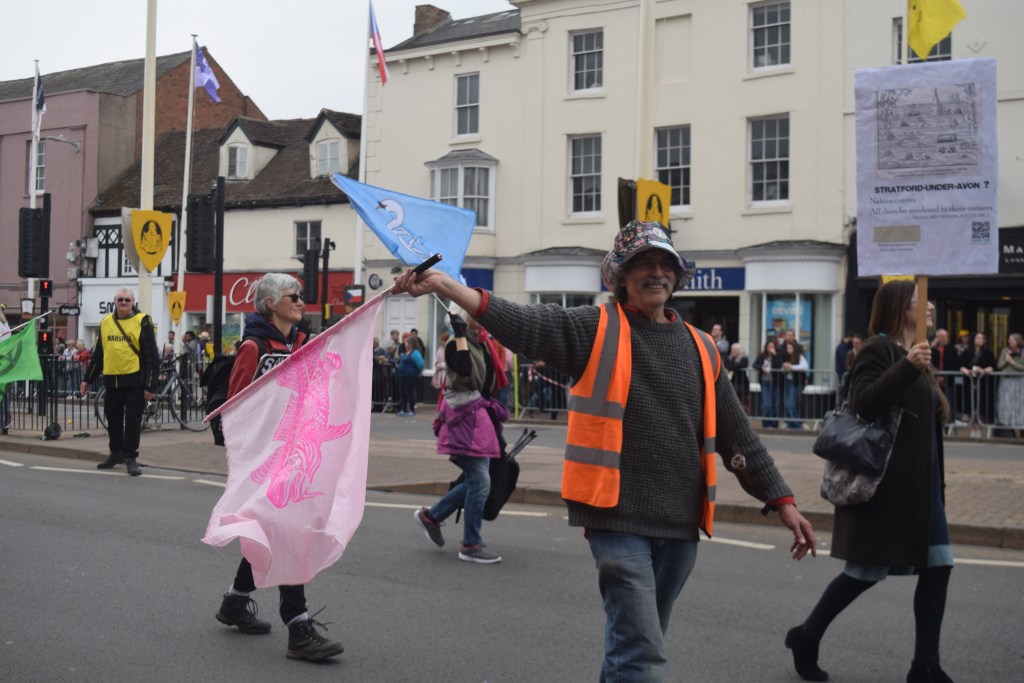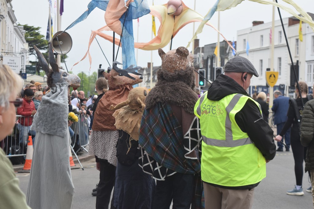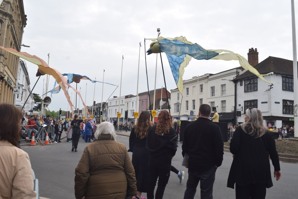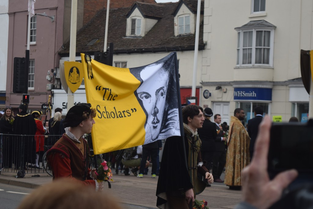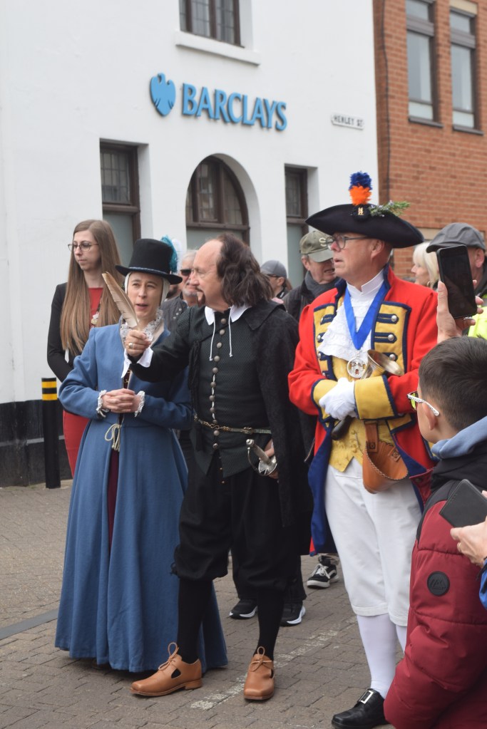 …4 more people had odd animal heads on, the pavements were stuffed, and I was squashed between a lady, metal railings, and a mobility scooter. The commentator asked who was from far and wide (and a Canadian flag was noticed by him), Shakespeare was on Henley Street by then – with a sword, quill, what may’ve been a short stick on beard, and a male and a female accomplice…