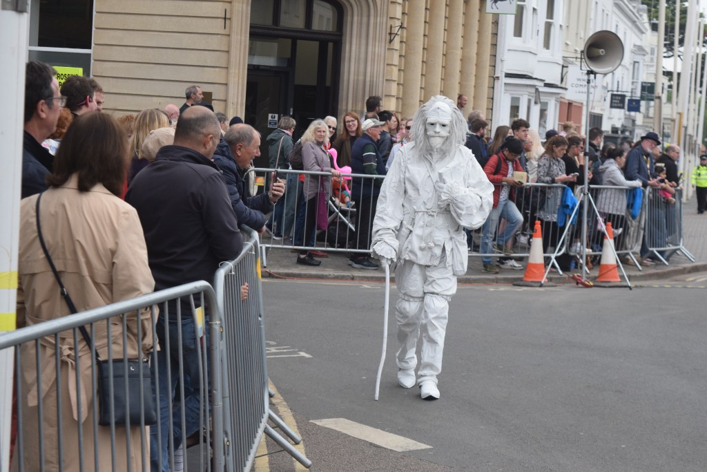 Shakespeare’s ghost (a man covered in white paint) strolling Stratfords streets