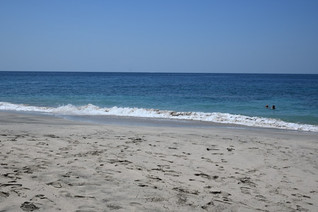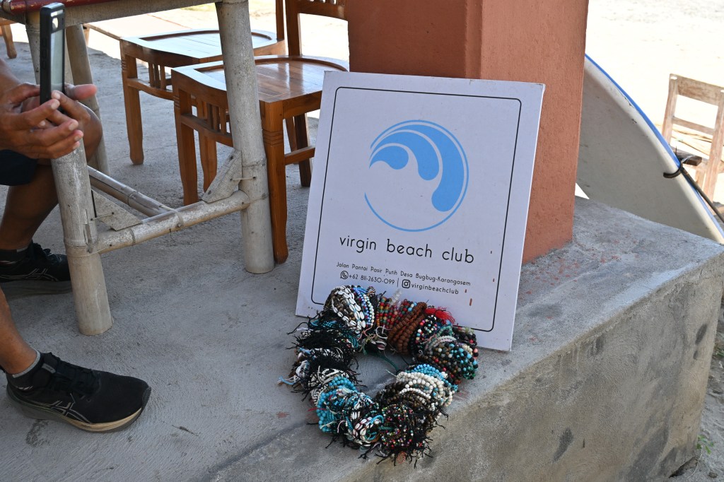 When the taxi moved again we went to a petrol station – where pump attendants were charging ten thousand of their currency per litre. The trip leader said oil prices are still subsidised by the government, and that mango season is coming up ( it’s about fifty thousand for 2kg); there was a krisnamart in a village, a mountain called Bukit Asah (it’s a plateau – the name meaning ‘flat hill’ – in East Bali, and it overlooks the beach and Kuan Island (which is shaped like a whale) got wiggled up – and led to Virgin Beach.