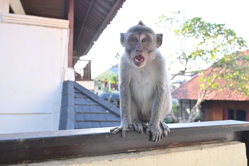 A very playful macaque (which I learnt are a type of third world monkey) perched on a balcony in Bali