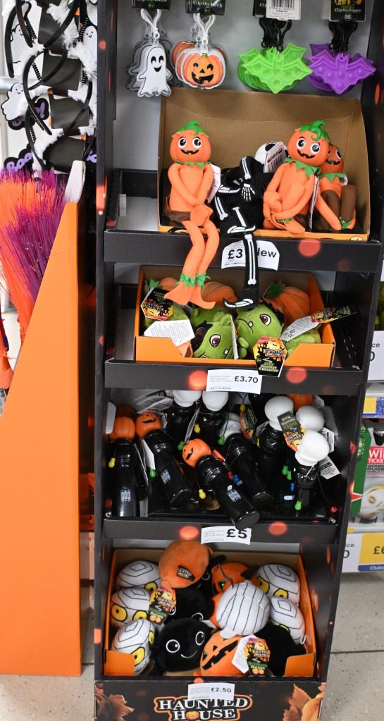 Jelly squeeze characters, broomsticks, bone-appetit dog biscuits, an eight foot tall skeleton (that supposedly ‘comes to life when activated’), and lots of fake blood are among things I’ve seen here in the shops this month (amongst lots of other stuff)…