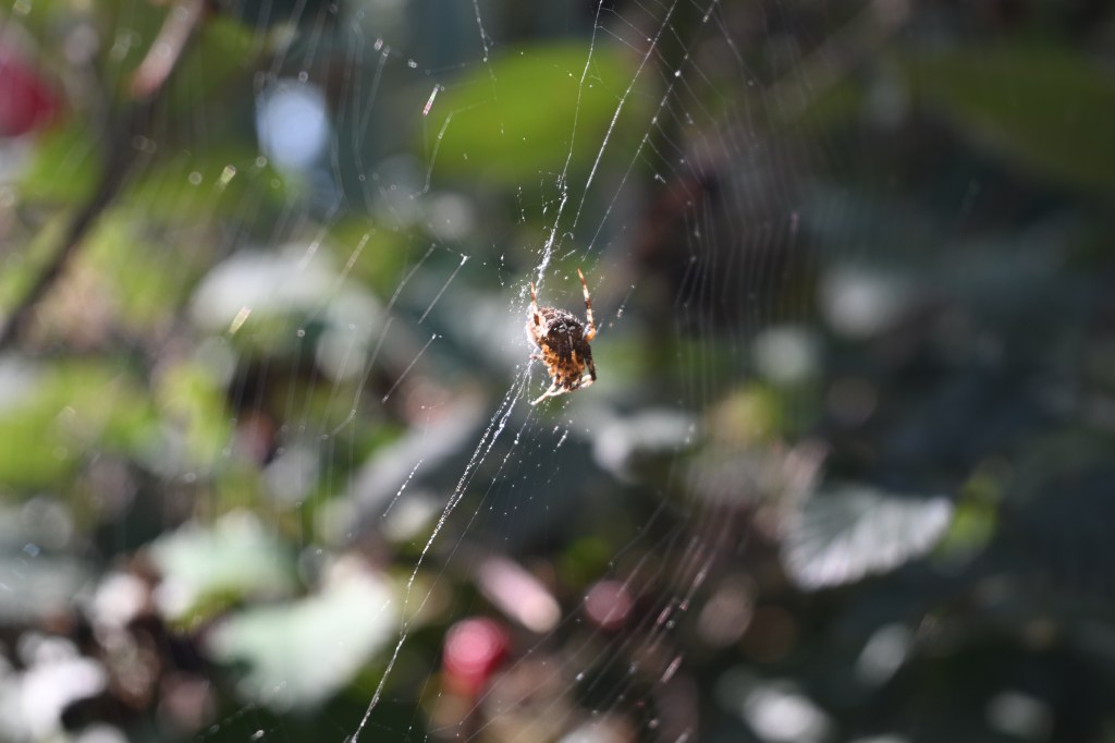 A spider (not scary) who’d been showing off his or her web spinning skills in the garden