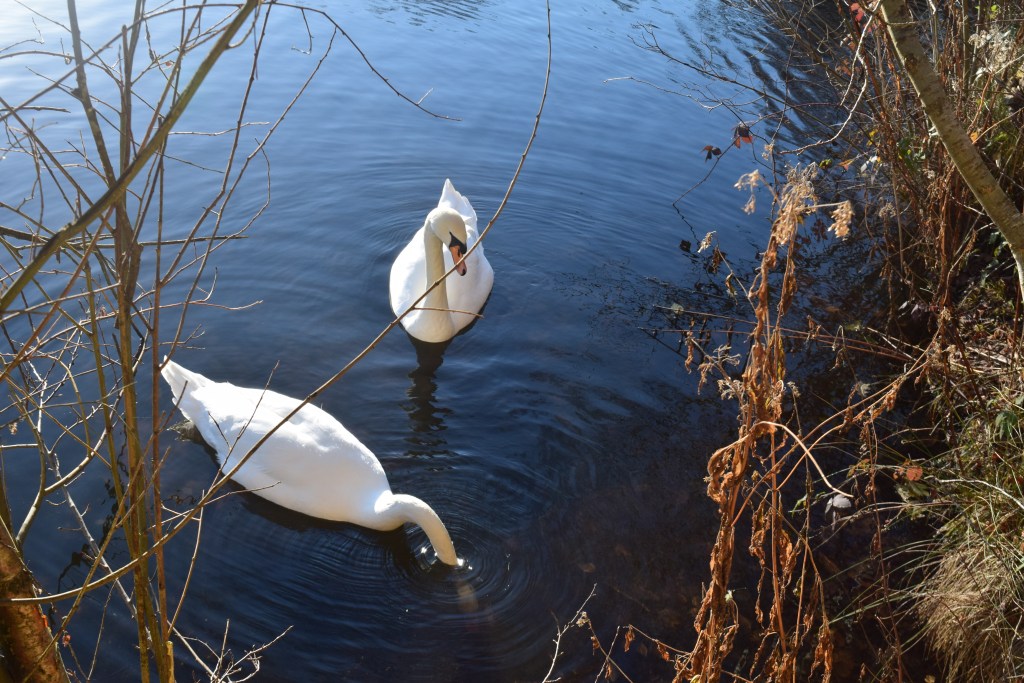 A couple of swans enjoying each others company at a nearby nature reserve – one’s on lookout duty while the other tackles the murky depths for breakfast…