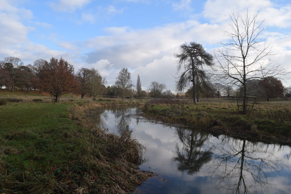 A few little bits of autumnal colour remain on the trees following the recent storms – and the reflection of the sky is an impressive one by this little country stream.