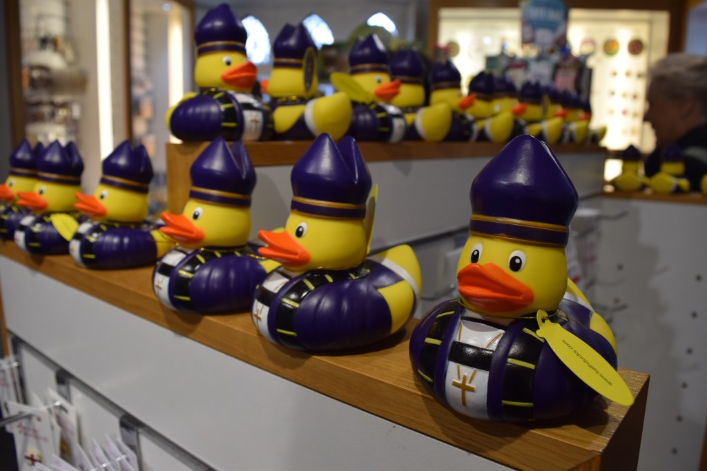 …and the ‘Chapter House’ – a big octagonal shaped room with enormous stained glass windows and 800 year old doors, and a tiny toddler was wandering around with her hand held by her mother and making squeaking noises and clearly enjoying the echoing sounds they made. In another corridor were several statues of men on plinths lying on their backs, 1 of them had a lion next to his feet, another statue of a Bishop (Richard Sterne – Archbishop 1664 ->1683) on a plinth reclining on a cushion had a tiny statue of a baby male angel/cherub either side of him (and was apparently the great grandfather of the author Laurence Steine), there was a model of the SS.Vale of Pickering boat, loud singing began coming from somewhere at 4.15pm, and there was a gift shop – with 750 piece jigsaw puzzles, York Minster Teddy bears, t-shirts saying ‘Beholdeth the new Apple I-Abacus’, and ‘Does anyone knoweth the WiFi code?’, and various rubber ducks in church clothing.