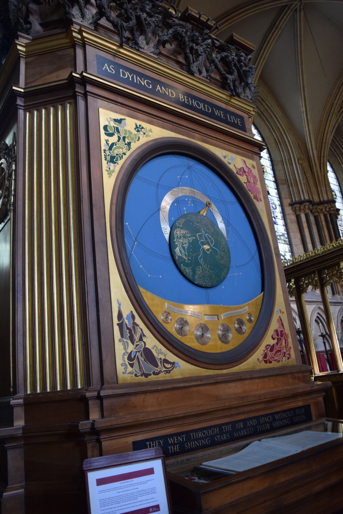Its route went under a 10ft 9 inch bridge, a 12ft bridge, passed the York Royal Mail delivery office, it was a very bumpy bus, and when we got off outside York Minster were several wedding photographs being taken; and inside we were told our tickets would be valid for a year (and I saw ‘Little Explorer’ red backpacks available). There was a large board mentioning a ‘Great Organ Project’, a tiny ‘Chapel of St Nicholas ‘, an Astronomical clock (which said above it ‘As Dying and Behold We Live’)…