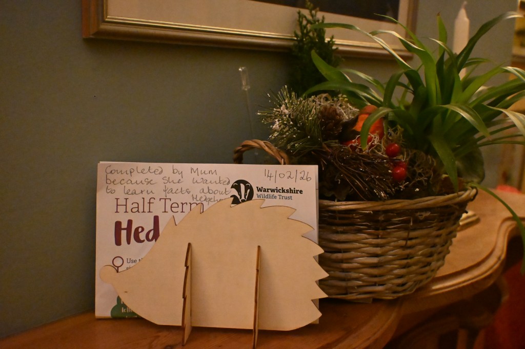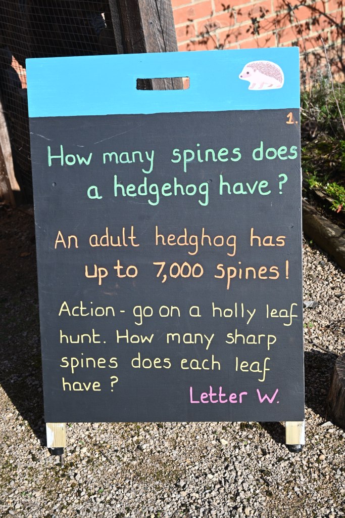In the shop/entrance area – I saw ‘Everyone Poops’ flash cards, Prickly Pile Up game sets, Bug Bingo, Poo Bingo, Dino skeleton excavation kits, and lots of soft toys; Mum wanted to do the hedgehog trail – and outside again, began (as instructed by the piece of paper) began looking for letters. I saw a plant labeled as an oesteospernem (meaning African daisy), a man with a massive camera lens, a propeller plane flew over, and kids in bobbly hats appeared and ran around, and a mother said to another mother ‘a puzzle outside in nature, what more could these children need?’; and a robin was doing loud twittering in a tree.