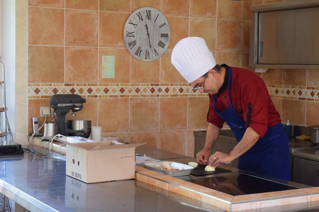 We went to a Carrefour Market in his car – (and he told me this was a small 1, and that the medium 1’s are called ‘Super Carrerfours’, and the big 1’s are called Hypermarkets, and then said he’d forgotten the list) – and he picked up lots and lots of bags of salad, and then lots and lots of avocados. There were ready prepared cheese boards (i.e. came on a wooden board), shrimp, and prawns, and oysters on the fish counter, enormous quantities of pepperoni/salami, he told me he lived in England for 18 months but it was 40 years ago, I saw some ‘Boyaust Naturels’ (which looked like the outsides of sausages), packets of fois gras, there were rolls of pigs blood on the delicatessen, rolls of wallpaper in the home section, basketballs, footballs, table tennis balls and rackets, a flat pack trampoline for €99, 50 litre bags of compost for €7.90, and John Paul signed the receipt (they do use chip and pin but he still signed it). I asked about the different supermarkets, which are Aldi, Lidl, Casino, Lecler, Super U, Carrefour, and Simply; and once we got back in the car, I asked about plastic bags – they have to use the reusable bags and he told me in more detail, but we got back (at 11.30amish), he unpacked the stuff, put an apron on, and stuck a big white chef’s hat on me, and then began rapidly chopping up onions.