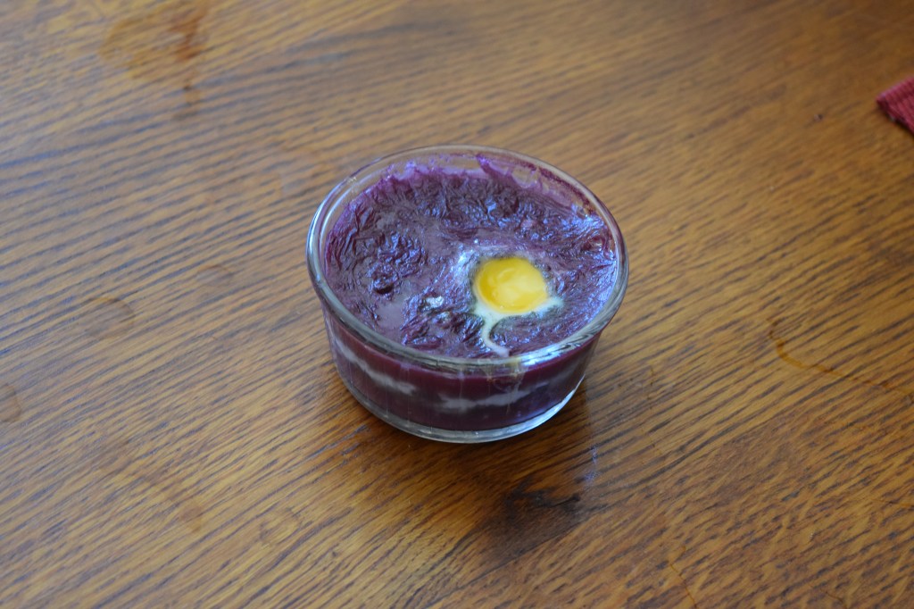 Some really thick chunks of ham were in a small bowl, the onions were finely chopped and put in a saucepan, and maize semolina was put in a small pan of water, he separated an egg and whisked it up in a bowl with red vinegar and ‘huile de tournesol’ (sunflower oil), Anamika was playing the piano – really well – in the room next door (she’s doing grade 5), and then he put 2 tablespoons of ‘farine de blé type 55’ flour in the pan with butter and the onions, some red wine, salt and pepper, and a glass of water and then let it boil (he said ‘the alcohol must get off’). He got the shrimps (which were for dinner) out of their shells (you have to take the heads off and then sort of peel the outer bits off), and while some wheat grains were boiling in a separate pan, he put the chunks of ham and the now purple stuff (which is called oeuf meurette) that had been in the pan, into little glass dishes (about 1 inch tall and 2 inches across), and then cracked an egg on top of each of them before putting them in the oven (and then he began laying the table – he said they bake for 10->15 minutes and should solidify, but not too much). He said ‘Sauce Moutard’ (i.e. mustard sauce) is made from mustard, pepper, salt, vinegar, and oil, and Anamika had come into the kitchen again by that point, there were rectangular chunks of the semolina in a dish of tomato sauce in the oven and another dish of chunks in a sauce of cream, parsley, semolina and garlic; and then everyone came in for lunch, and I asked John Paul what the names of the various things were (‘polenta se percil et garlic’ was the white stuff, ‘oeuf meurette’ was the purple-y coloured pudding, and ‘polenta et tomate’ was the red stuff).