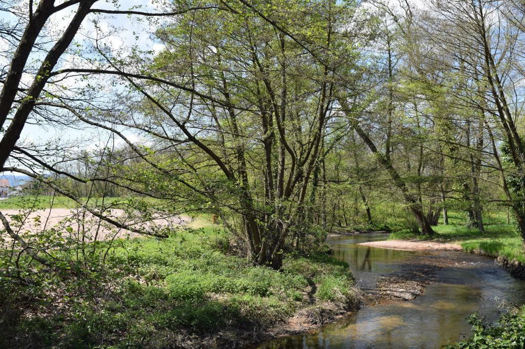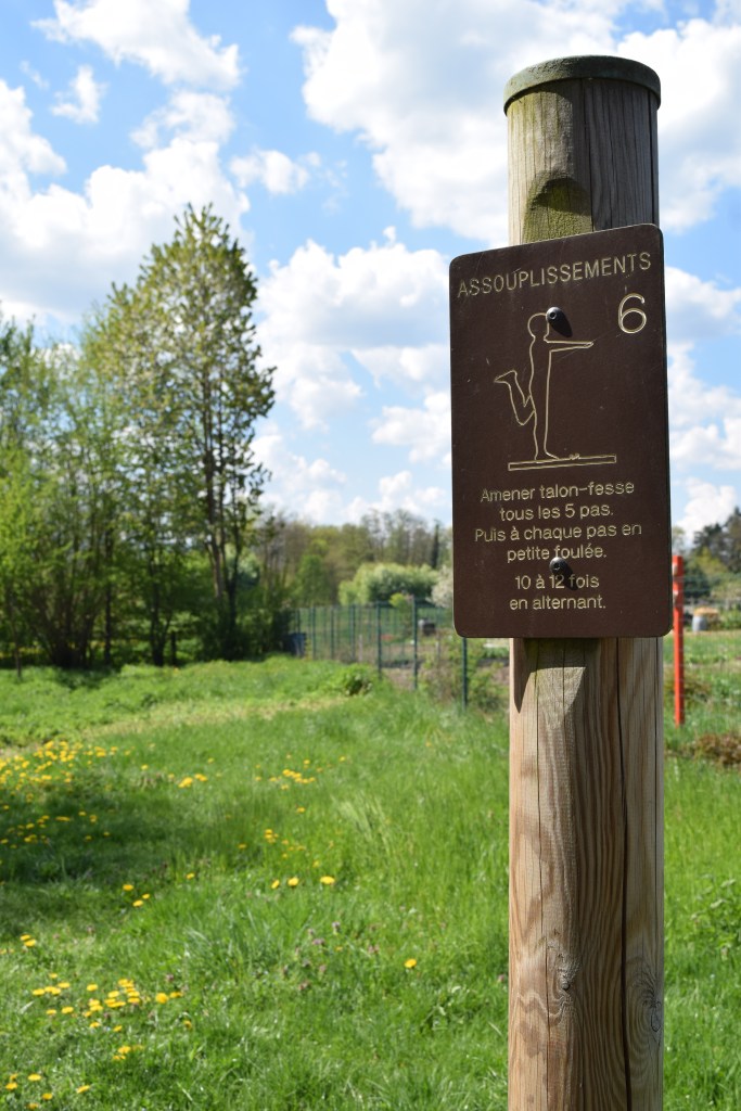 …and a very sprightly looking Jack Russell terrier was walked past by a woman also pushing a pram; there were some signs on wooden poles next to the path with signs on suggesting activities for families and individuals, several people were fishing, 5 dogs were playing in a field nearby, some trees had phrases such as ‘je chante’, ‘j’ai calme’ and ‘je sublime’ painted on their trunks, there were allotments noticed as we made our way back, and I forgot when we returned to our room.