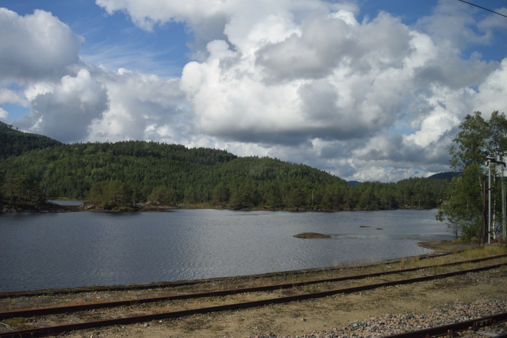 Quite a few big mountain lakes were visible between the rocks, and the train was jiggling a lot; Lunde was passed at 12.18pm, the lady was telling someone on her phone to start gargling a bit of salt and that they’d seen all of Eric’s friends; and then Bo seemed to be the next stop, and was reached at 12.28pm (and my phone said it was 16°C). A little town called Grarv was the next one passed, Akerrhaugen seemed to have a massive lake in it, and Nordagutu was stopped at at 12.43pm; and at 12.55pm I was told we had an hour and a half to go.