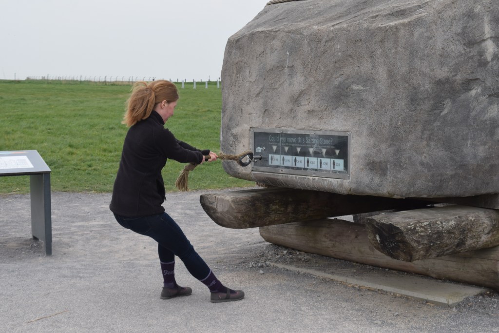 With me, we went down a long path and got blown around a lot; at the visitor entrance Mum nearly lost her receipt due to the gusts (meaning some chasing of it was necessary – a random man managed it), and further inside the building was a timeline. That room had examples of late Neolithic tools, the skeleton of a man buried in the Winterbourne Stoke longbarrow around 5000 years ago, another skeleton (in lots of pieces), Bronze Age tools, fragments of barrows people got buried in, remnants of peoples food (including cattle and pig bones) (and my mother thought the replica of the skeletons head was very handsome), a description of Woodhenge, and what was done at Stonehenge. A woman had a child in a chest carrier (seemingly self made from a scarf) – and when asked, we discovered that the child was 3 ½ weeks old; outside there were several thatched huts and a massive replica stone (apparently the original weighed about 28 tonnes) that people were invited to try and move.