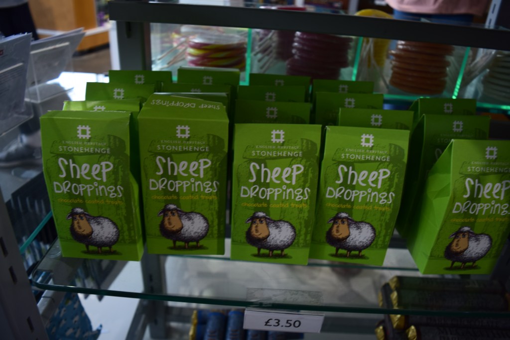 Then we got on a Stonehenge bus at 10.30am, got off 5 minutes later, there was an emergency defibrillator on the path, a woman wearing really big fluffy earmuffs, a couple of signs saying ‘slip hazard’, several people with selfie sticks, a small group of people in martial arts clothing who appeared to be posing for photos, and the unbelievably long queue of traffic on the road in the distance was getting longer. A sign said a stone weighed about 40 tonnes, there were more American people taking selfies, and walking back down the hill I saw a little pug dog wearing a harness that said Kevin on it, and we set off- on foot – back to the car park at 11.02am. Aubrey, Sarsson, The Lone Ranger, and The Rock were other buses seen on the walk (and a couple of skylarks in the sky); back in the visitors centre at 11.32am – there were wooden swords, ‘The Amazing Pop Up Stonehenge’ books, packets of chocolate sheep droppings, cork hot plates, shot glasses, chocolate golf balls, lots of other chocolate things, various animal soft toys, Neolithic human soft toys, and woolly clothing for sale. A very fluffy Dachshund was being carried/cuddled, and I saw a man wearing a black hoodie with ‘1984 IS NOT AN INSTRUCTION MANUAL’ on it while we walked back to the car park in extremely cold gusts, and made it just before 12pm.